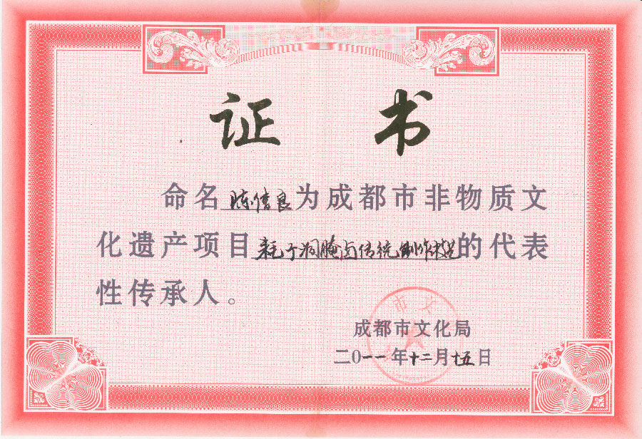 陈信良先生,出生于1949年,自幼学艺、专研技术,以制作四川传统卤鸭等系列莱品为专长。现为成都耗子洞名特食品厂总经理、耗子洞第三代传人、烹饪大师。1981年赴美国“荣乐园”从事腌鹵系列菜品制作,1984年回国担任耗子洞鸭店经理,1989年带队参加全国食品大赛,以自创菜---樟茶鸭获中商部金鼎奖、中国名菜称号。1992年樟茶鸭获首届四川天府食品博览会金奖。1999年率队参加全国烹任大赛,以全鸭莱品“大众筵席”夺得金牌。2000年耗子洞鸭店荣获国内贸易部“中华老字号”称号。